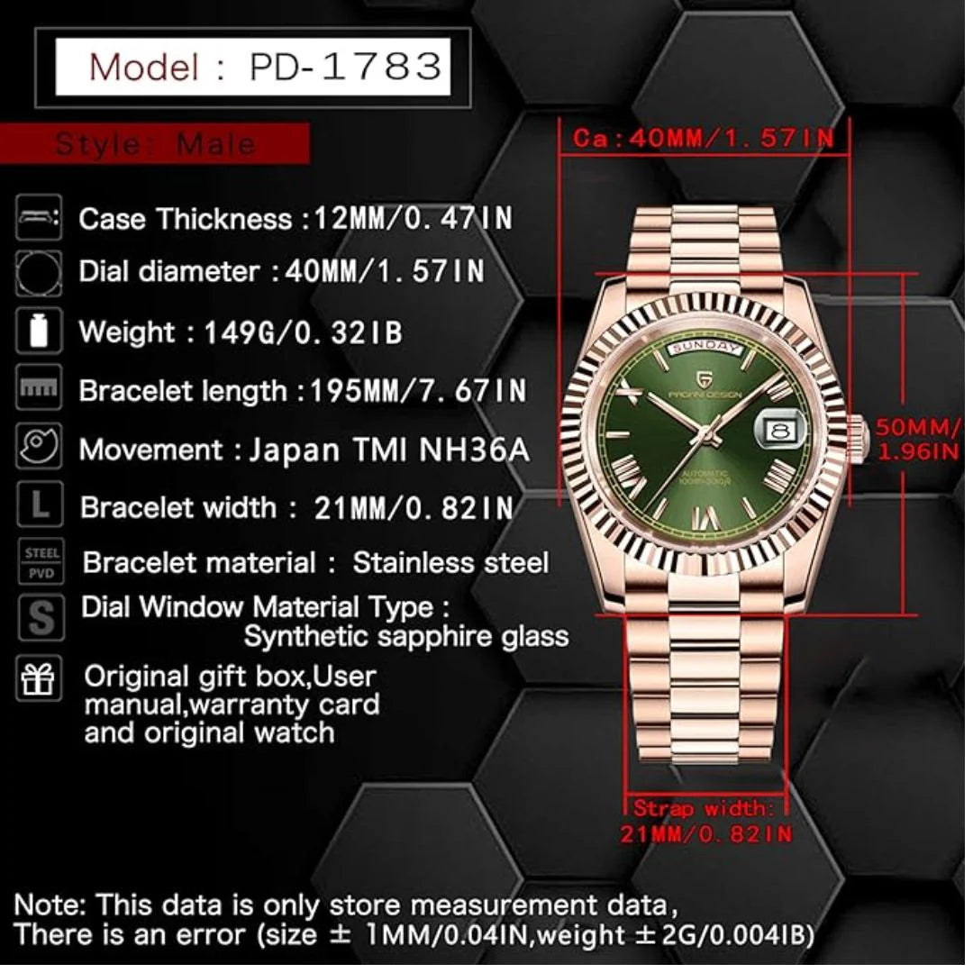 Material: stainless steel construction, Synthetic sapphire dial window(AR Coating), and top Japanese TMI NH36A automatic movement